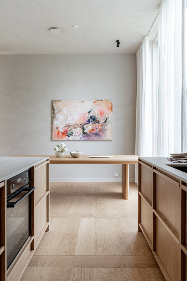 In the photo (above): Oulu Housing Fair site 19, Hietasaaren Gård, Building B. The family chose Timberwise Oak Classic 185 × 925 mm in Herringbone Ladder pattern, Nordic shade, brushed and matt lacquered.