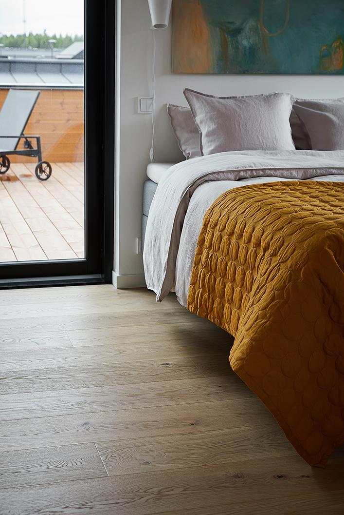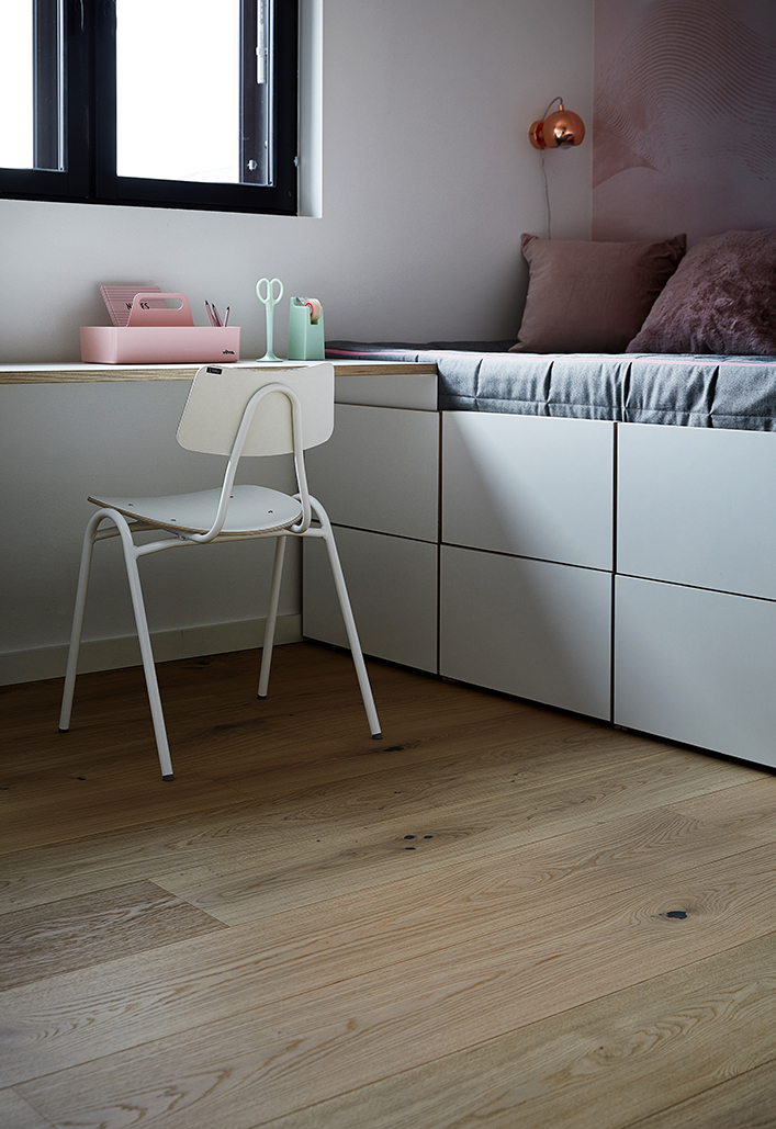 Our family has two adults and two children, no pets. Some traces of life are visible on the floor, of course. There are a few scratches here and there, or dents caused by things being dropped. These are mostly in the children’s room. They blend in well with the living surface, though, and don’t really stand out at all. Cleaning the wooden flooring is really easy, and the colour we chose doesn’t highlight any dirt or stains.