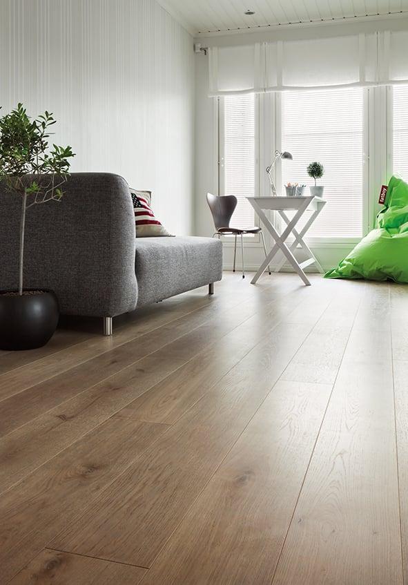 All types of wood can be damaged by excessively dry indoor air. If the relative humidity of the indoor air falls below the recommended level of 35 to 60%, cracks may appear in the floor. To prevent this, remember to monitor the humidity of the indoor air, especially during winter and other dry periods. Add moisture to the air if necessary, for example with a humidifier. Larch reacts most sensitively to dry indoor air, and hairline cracks or fissures may appear more quickly than with other woods. The optimal relative humidity level for wood, 35 to 60%, is also the optimal indoor humidity for humans.