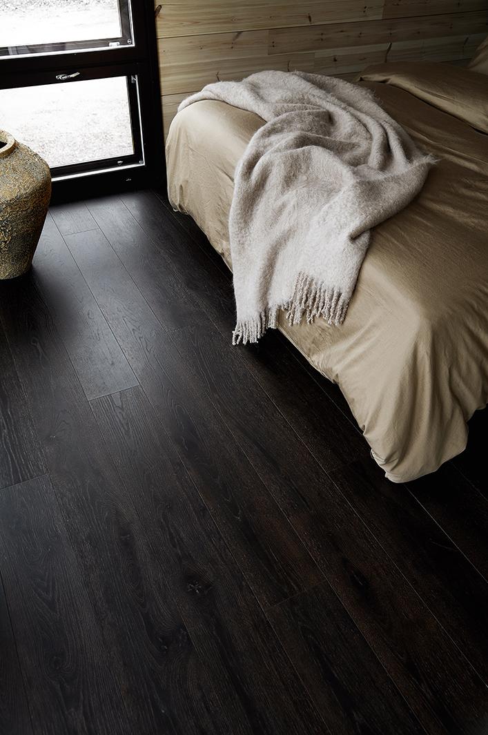 A deep, dark and opaque brown, similar to the colour of walnut. The brushed surface of this attractive and timeless floor accentuates the wood grains beautifully.