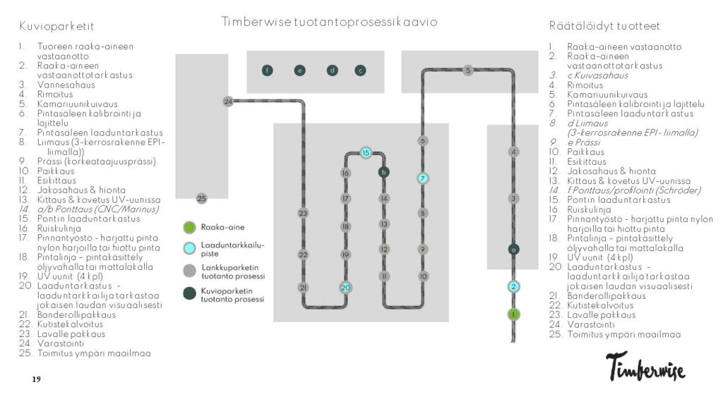 Timberwise on 100-prosenttisesti suomalainen perheyritys. Kaikki puulattiat valmistetaan omalla tehtaallamme Loimaalla alusta loppuun asti — sahauksesta kuivaukseen, puristukseen, ponttaukseen, pintakäsittelyyn ja pakkaukseen. Yli 20 huolellista työvaihetta ja osaavan tekijän kädenjälki takaavat laadun, joka kestää sukupolvelta toiselle. Valitsemalla Timberwisen, tuet suomalaista työtä, paikallista osaamista ja verotuloja, jotka jäävät kotimaahan.
